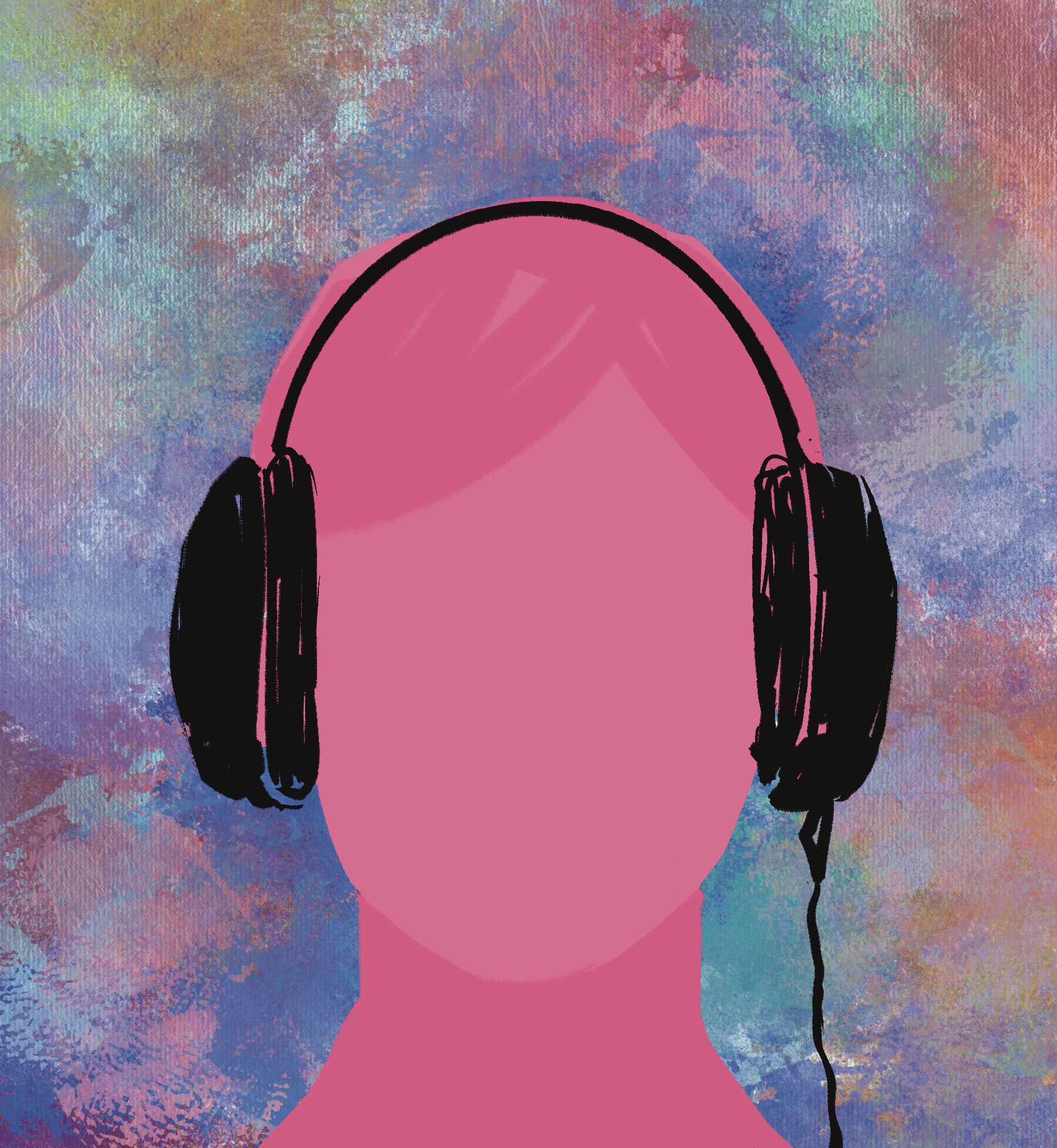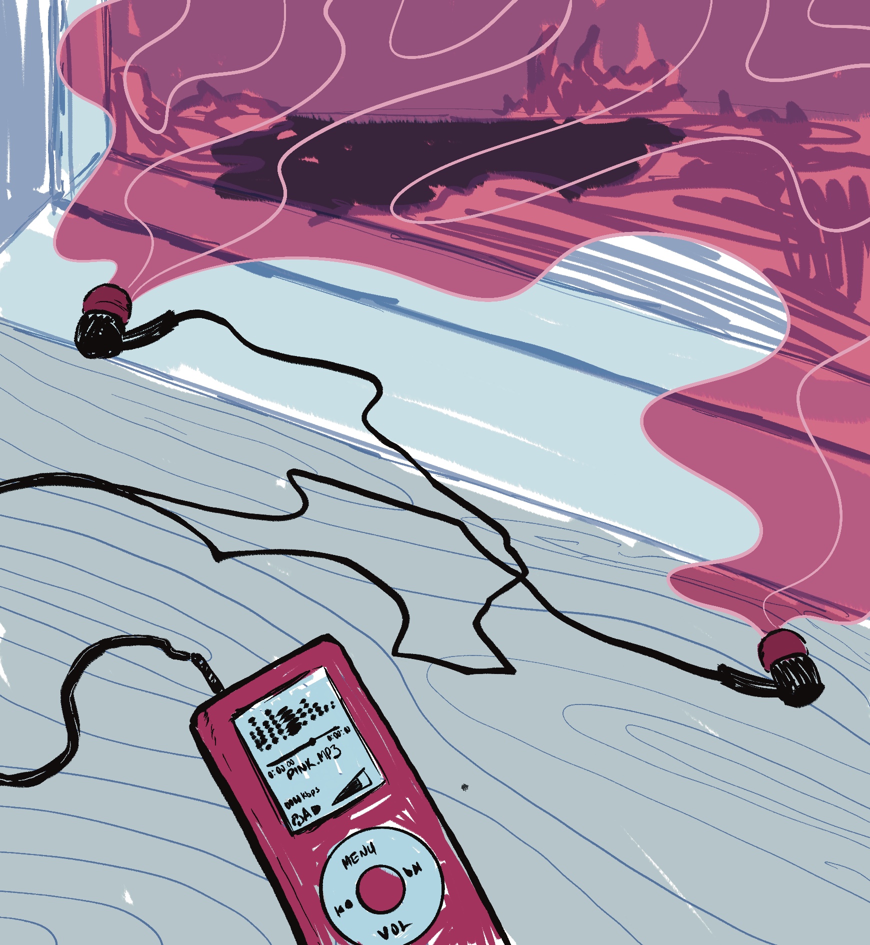 Editorial illustration for an article about the different colors of noise. There was a specific line that stood out to me about pink noise enveloping the world.