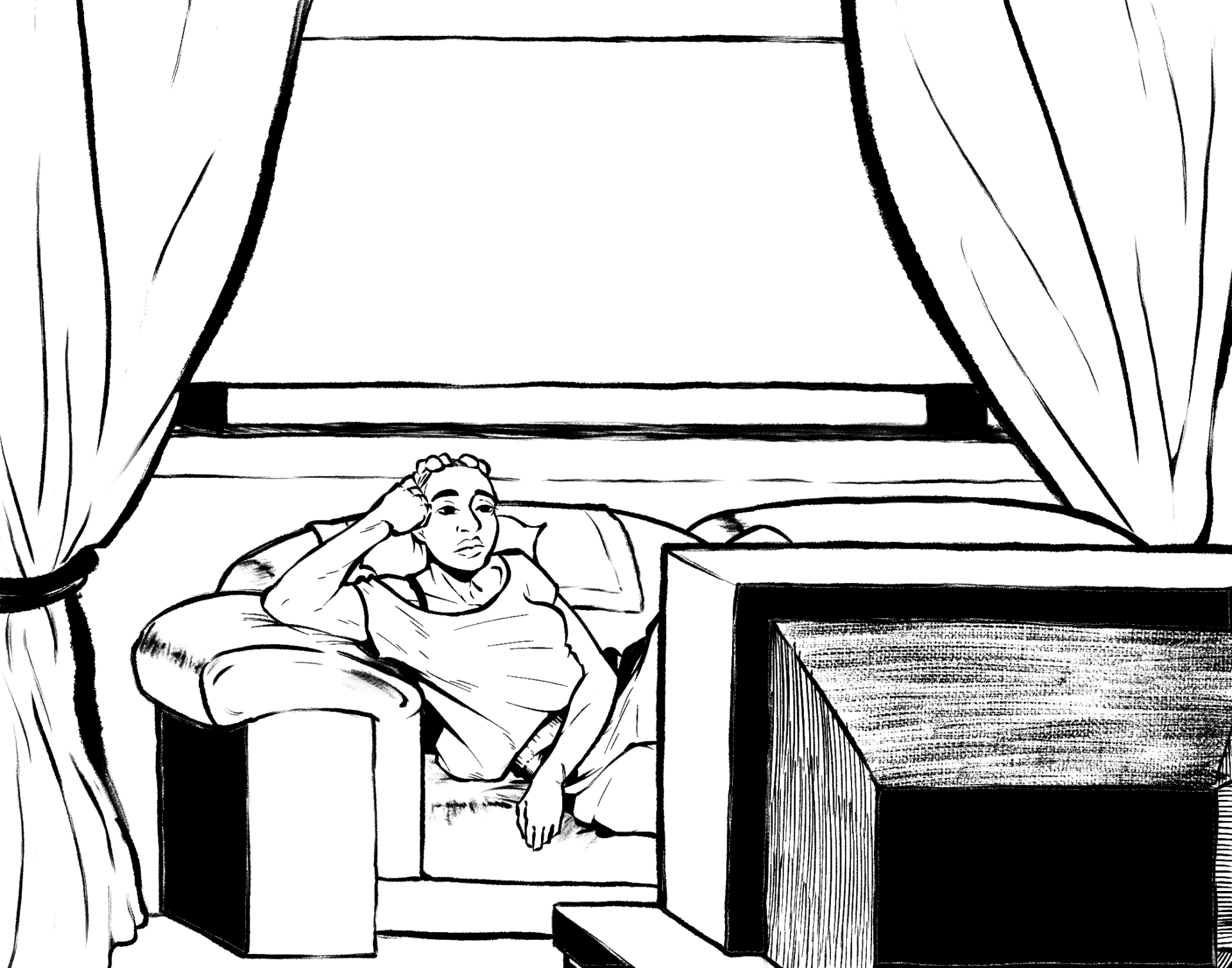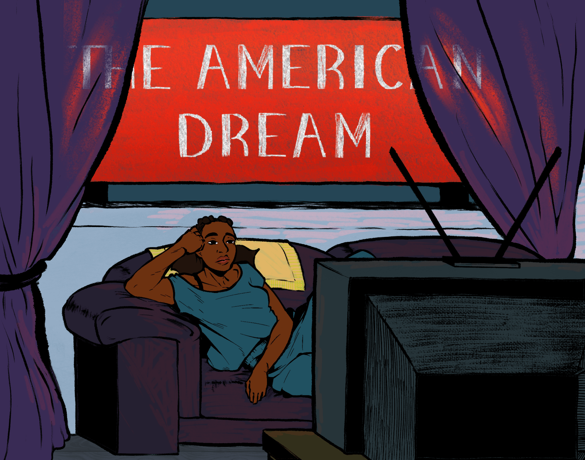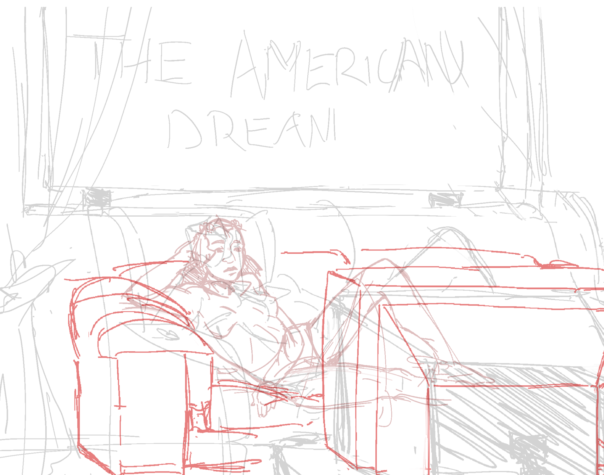 The American Dream is built on bloodshed and tyranny and the powers that be seek to distract us from our brutality through mind-numbing entertainment. The character on the couch is the protagonist in BLOODLUST. My day job is at a high school and there was a unit on whether or not the American Dream is dead; the kids thought we were talking about the mall next to MetLife Stadium.